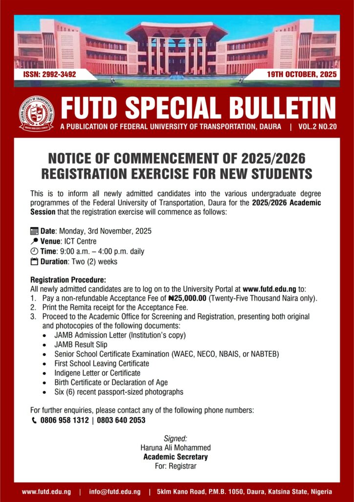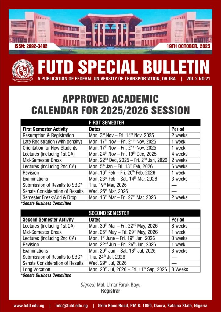 The Federal University of Transportation Daura (FUTD) is located about 5 Km along Kano Road from the City of Daura in Katsina State. The University is situated on a 280.58Ha piece of land located in the present-day Sandamu Local Government Area, Katsina State, and the Certificate of Occupancy (C of